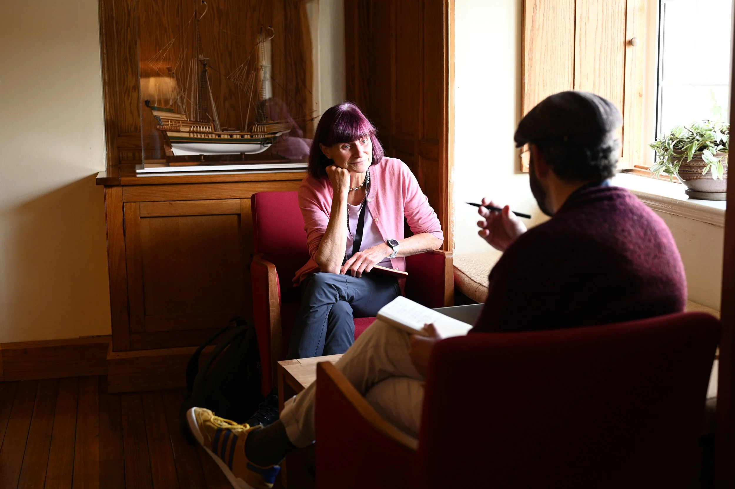 Photo: Stowe mentor Olivia Hetreed (left, Screenwriter, GIRL WITH A PEARL EARRING) in a one-on-one mentoring session at the 2024 Connemara Writers’ Retreat.